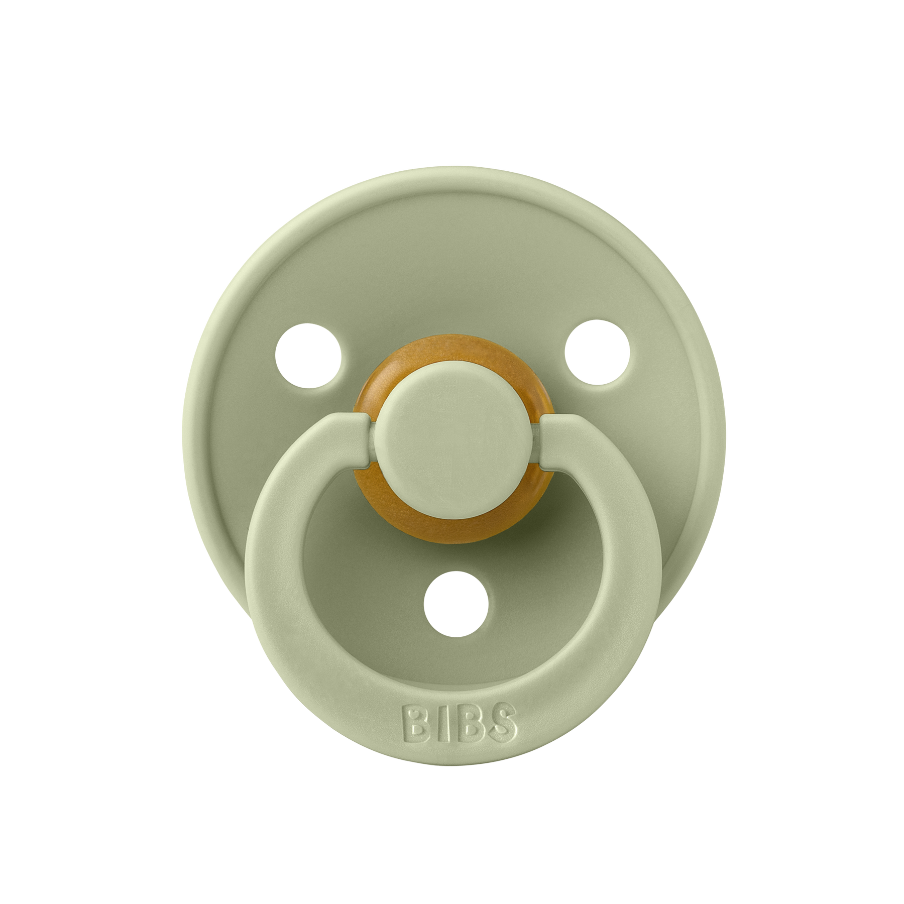 The BIBS Colour Latex Pacifier in Ivory/Sage has a signature round shield with three vent holes and round BIBS engraved handle ring.