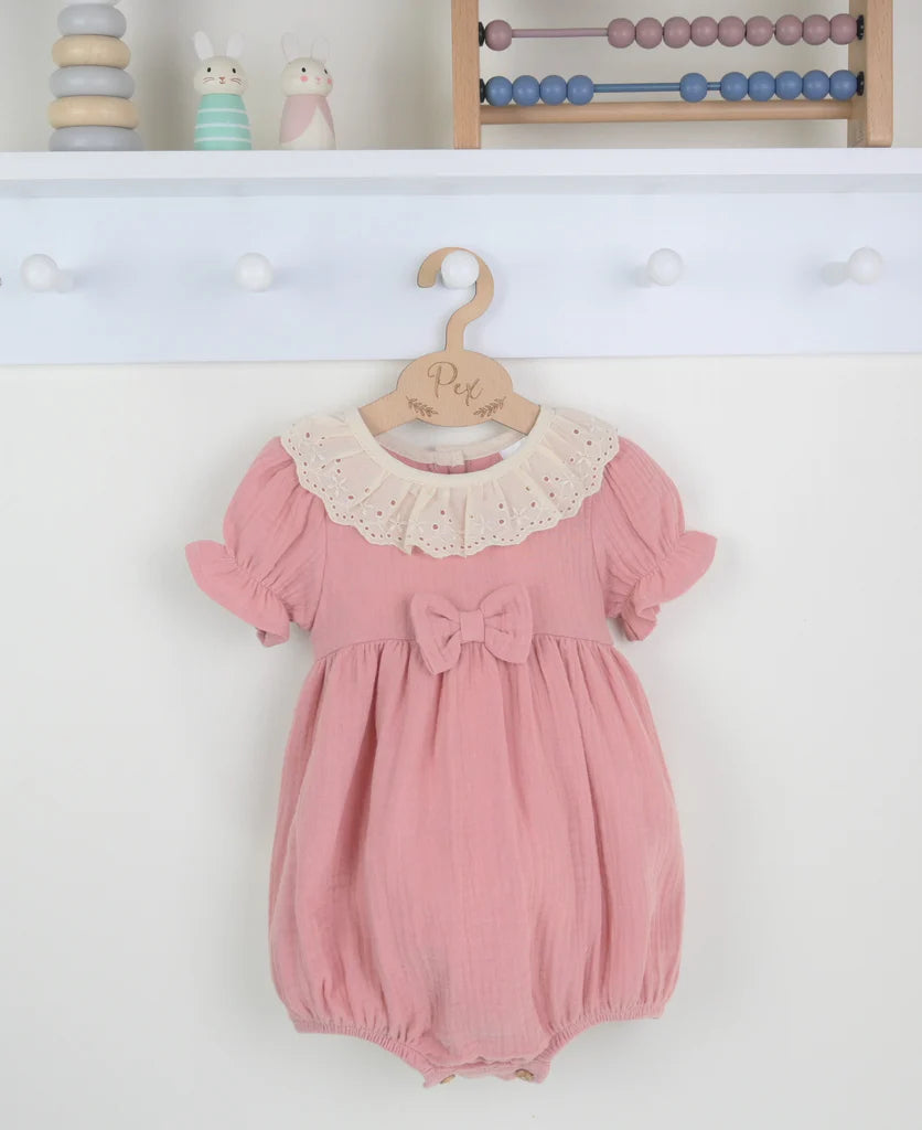 Made in a lightweight muslin/cheesecloth in a pretty dusky pink, this romper is simple yet chic.  With a bow applique to the waist and a vintage style lace trim around the collar.