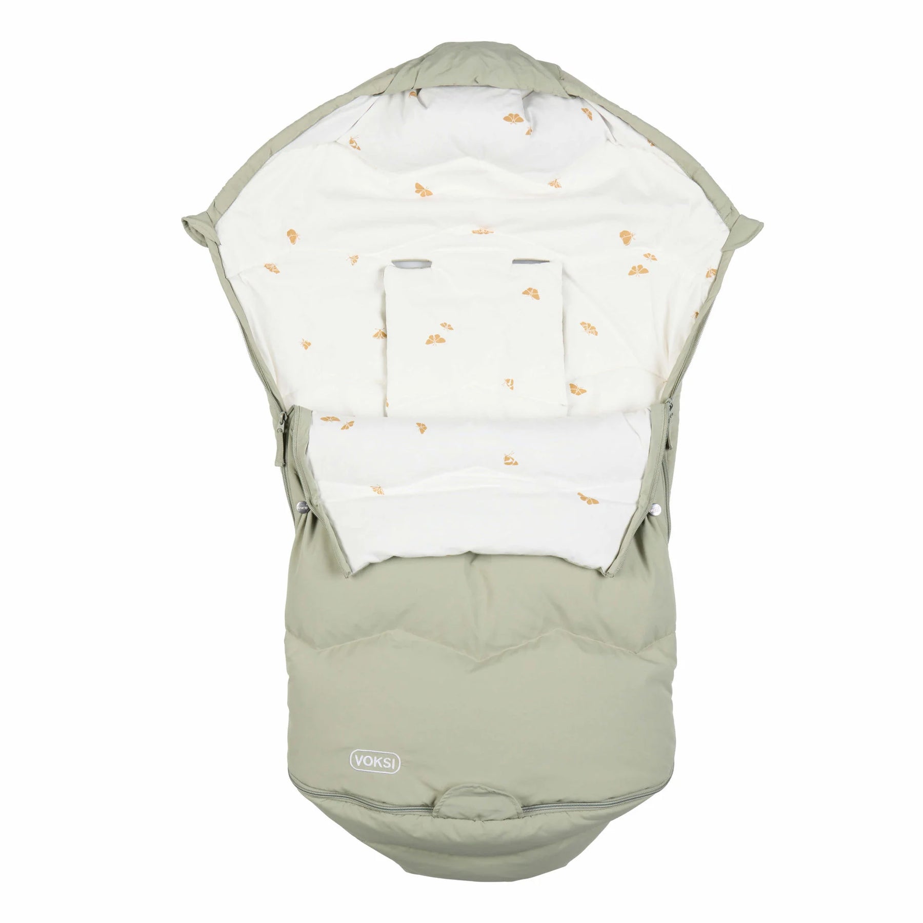 On the outside, the sleeping bag is coated with BIONIC-FINISH®ECO, which makes the bag naturally water-repellent and will protect against snow, wind and rain. All the materials in Voksi® Explorer are OEKO-TEX®standard 100, class 1 certified, which is a quality label that indicates that none of the materials in the product contain harmful chemicals. A cord around the head area can be adjusted to suit your child’s needs and preferences in different weather conditions. The side openings allow you to fold down the front for optimal ventilation and good visibility when the child wants to explore the world while sitting. The bag can be separated and the back part can be used as a seat inlay or as a play mat.