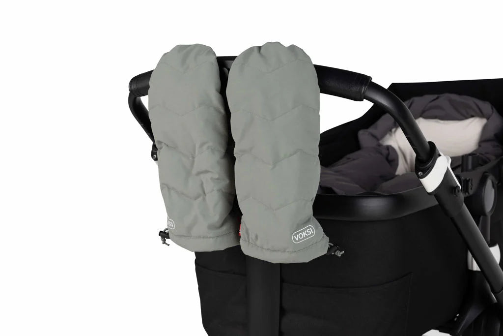 The mittens are designed to fit all strollers and hands during a stroll. Attach the mittens to the stroller by opening the velcro at the tip and placing them around the handle. A simple cord on the side can be tightened to prevent cold from getting in the mittens. Mix and match the colors with the Voksi sleeping bags and baby booties.