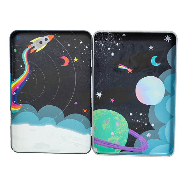 Playtime fun in a handy magnetic tin! Contains 3 sheets of pop out magnets so you can have fun sticking over 50 bright, fun magnetic pieces to the 2 fun scenes on the inside of your tin and let your imagination run wild creating fabulous pictures with space people, aliens, space ships, rockets and much more. A perfect pick up gift, printed with soy inks and made using recycled materials. When you're finished playing, the magnetic tin safely stores all your pieces ready for next time.